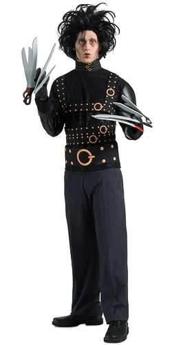 JacketGlovesWigRecreate one of Johnny Depp’s most memorable characters! The jacket consists of polyester material with grey accents made to look like leather. Foam straps with yellow detail cover the front of the jacket and the lower portion of the sleeves feature shiny vinyl-like fabric. Included are a pair of black and silver gloves with foam scissors attached. Also included is a black wig. Become Edward Scissorhands this Halloween with this classic costume.