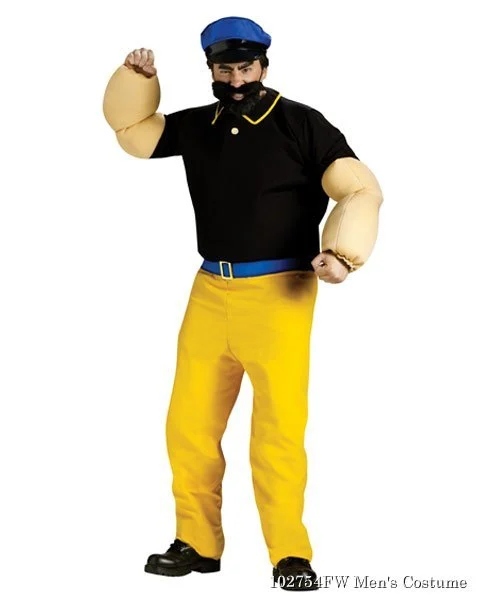 The Officially Licensed Adult Popeye’s Brutus Costume is the fourth official Popeye costume in our collection. Just like the character in the cartoon and comic book, Brutus is big and mean. When not making trouble on the wharf, Brutus is usually trying to steal Olive Oyl from Popeye. The Brutus Costume features a black shirt with gold trim on the collar, padded muscle arms, yellow pants, a blue belt and a sailors cap. This costume looks the best when worn as a group with Popeye, Olive Oyl and Swee-pea too.