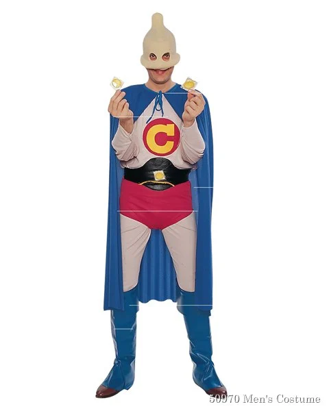 Be a champion in the war for safer sex when you wear this hilarious Captain Condom Costume for Adults. This one of a kind costume is guaranteed to elicit laughter when you show up at your next theme party or Halloween bash. This original condom man outfit consists of a mask, blue cape, shirt with a big “C” emblazoned on it, briefs, and a belt with a pouch for your condoms complete an ensemble that is a laugh riot waiting to happen. This costume is a great excuse to question all of the women at your next party about their sex lives, and while you might get slapped a few times, you also may get a few offers you can’t refuse. Check out this and other great costume ideas from Wholesale Costume Club, home of the best selection of costumes at the very lowest prices.