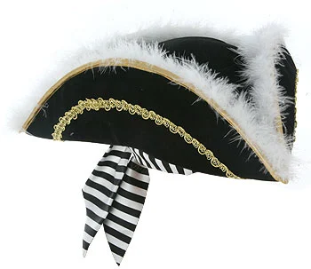 Captain Meyer Hat:This Captain Meyer pirate hat is a perfect addition to any pirate costume, even Jack Sparrow. The black tricorner hat is made from high-quality foam to maintain its shape and provide a comfortable fit. It is has the appearance of velvet while decorated with white marabou along the top, gold trim and intricate gold stitching on the side. A striped black and white bandana is attached and the hat has a circumference of 24″.