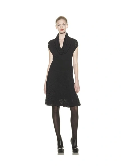 Medium-weight, mixed pointelle pattern, cowl neck, banded ribbed waist, cap sleeves, slightly full skirt