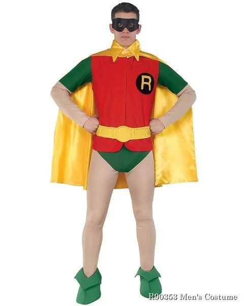 Eye mask, cape with attached collar, shirt, pants with attached shoe covers, molded latex belt