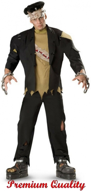 This monster costume includes a tattered jacket with stitching details and attached shirt with scar graphic, tattered pants, shackles, vinyl monster headpiece and vinyl monster shoe covers.