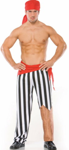 This Pirate has wrestled with sharks and pillaged ships for booty, but he’s got his eye on more than just that this Halloween. His sea-faring costume features stretch black and white striped pants with a faux wooden leg, a red head bandana, and a matching red tie belt. Jump on board his ship-he’ll have room for you!