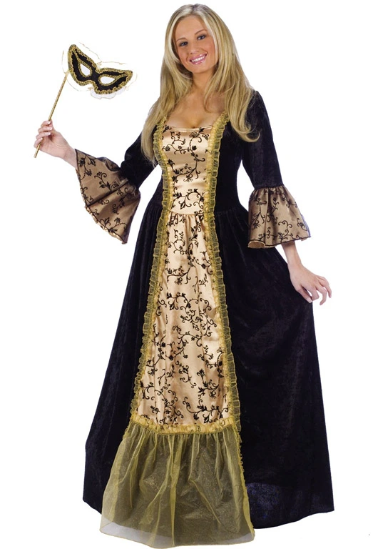 Includes: Crushed black velvet dress with shimmering gold inset, ruffle sleeves, and handheld eye mask.