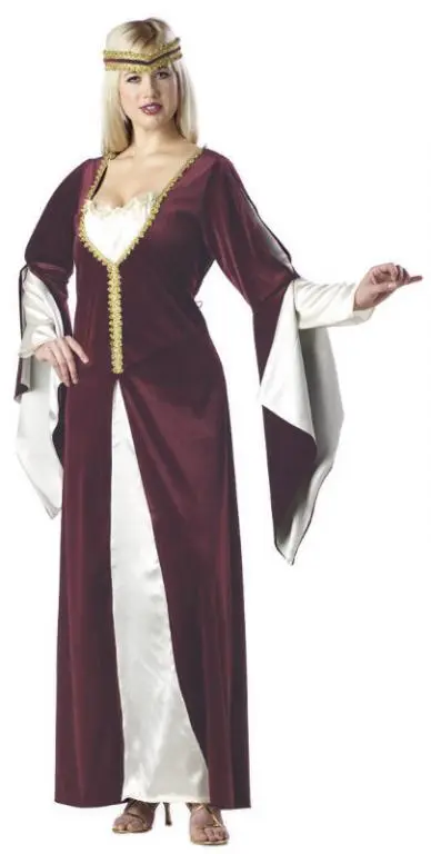 Medieval RomanceCostume includes: A velour Burgundy and satin dress with Gold trim detail and headpiece. Available size: