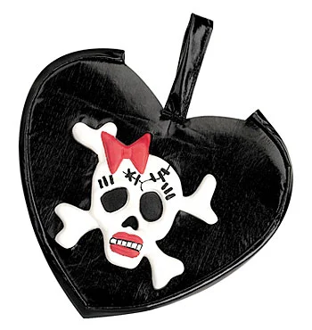 Black Purse w/Skull AppliqueComplete your Gothic costume with this skull handbag! The cute purse measures 8″ across and 6″ in length. It is made from foam to maintain its shape and has the appearance of black, shiny vinyl. A female skull and crossbones with red lips and a red bow is featured on the front. The handbag has a short black handle and velcros at the top for closure. Excellent with our Gothic cheerleader or Gothic monster bride costumes.