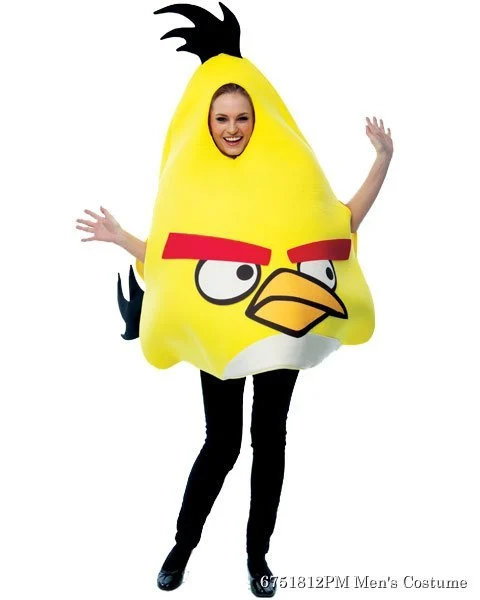 Dive bomb your way to killing those pesky pigs in the Unisex Angry Birds Yellow Bird Adult Costume. Angry Birds has taken the mobile gaming world by storm, selling more than 12 million copies from the Apple App Store. You’ll eliminate plenty of pigs in the Yellow Angry Bird costume that features a triangle one piece over the head plush body suit. At the top of the Yellow Angry Bird Halloween costume is a tuft of black hair. Underneath the hair is a hole for your beautiful face to speak through. Below the face hole are thick red eyebrows, large white eyes with small black pupils and a orange bird beak all screen printed onto the costume. Below the beak is a white patch representative of a bird’s belly. At the back of the costume there is another black tuft of hair similar to that of a bird’s tail feathers.
